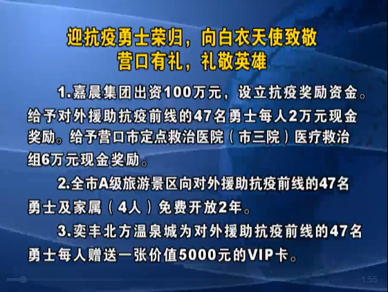 嘉晨集團以體現大企業的責任與擔當,出資100萬元,設立抗疫獎勵資金。給予對外援助抗疫前線的47名勇士每人2萬元現金獎勵;給予營口市定點救治醫院(市三院)醫療救治組6萬元現金獎勵。以此表達對抗疫英雄的崇高敬意和無限愛戴。